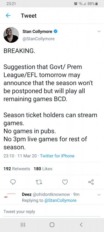I think the more time goes on, the possibility of finishing the season becomes more and more unlikely, even behind closed doors, in terms of guaranteeing player safety and using up resources that could be better used elsewhere. I also accept that as much as I am desperate to watch any football, the notion of having anything like a similar interest and passion in behind closed doors results and matches is probably unlikely. If Rovers somehow got into the top 6 for example, I suspect I would resent the fact that I couldnt go and see the games. Next season should be the priority and salvaging as much it it as is reasonably possible. Any talk of a conspiracy towards making a decision in any way focused on getting Liverpool the title is absurd though. As much as I dont want them to lift the Premier League. -
