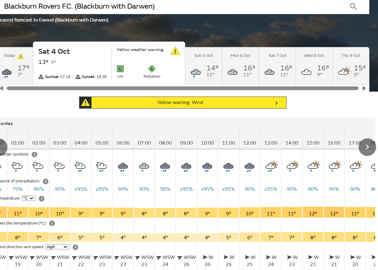 8. if this weather continues there is no way the game is going ahead,it only started raining against ipswich at midday and look what happened,it`s monsoon like near chorley,assume it`s the same 7 miles up the road in blackburn,at least we won`t get beat,only by the weather🙂