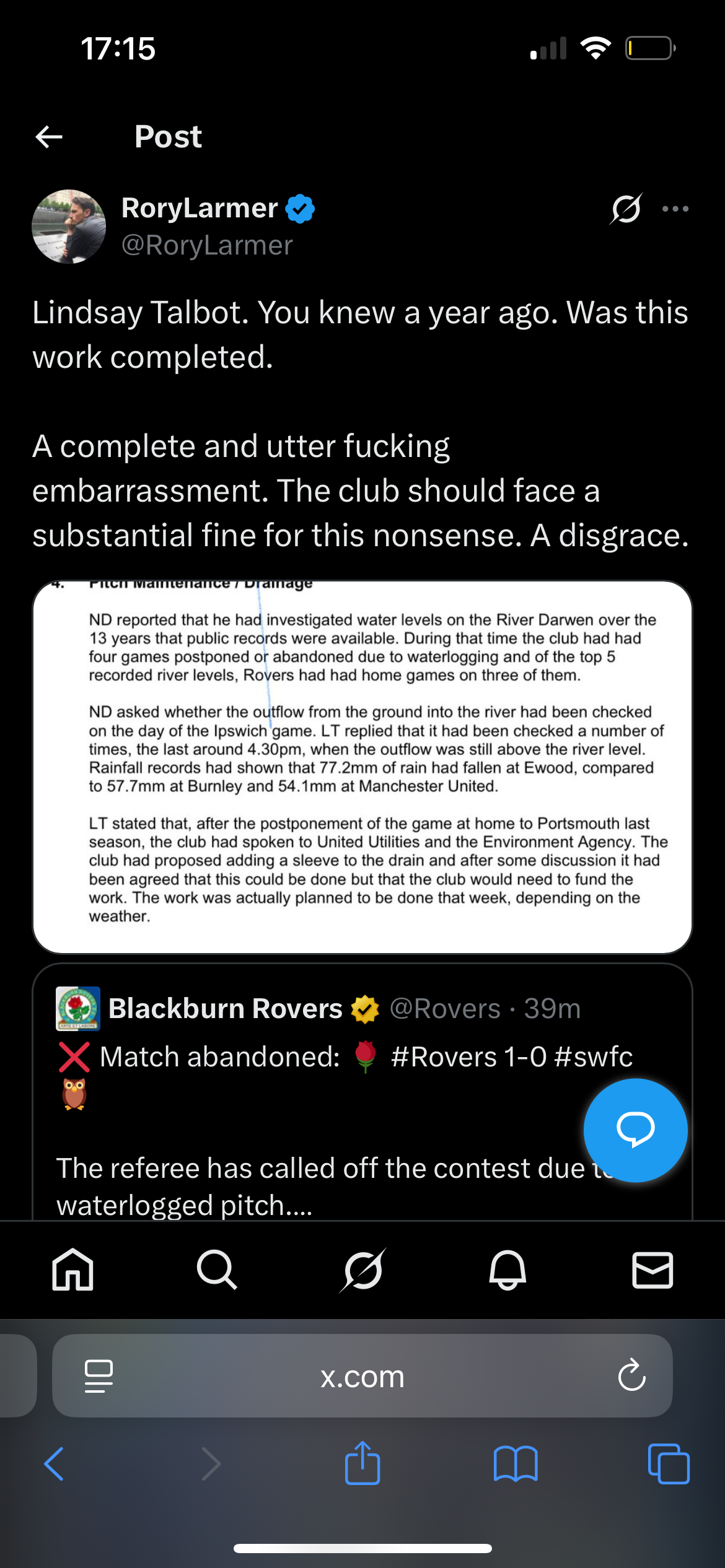 Absolutely shameful and embarassing. All comes back to the owners not funding that full pitch revamp. Dont allow for or get sucked in by the nonsense. Referees, opppsition managers, rainfall miles higher specifically in Blackburn, how its not our fault. It is 100% our fault. Its on the owners. Last time they were struggling to find precedent on how to finish the game. This time, we have some from the same Championship ground a couple of months ago. -