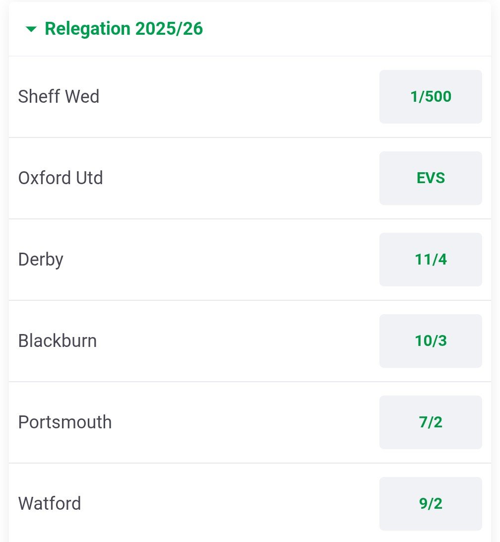 Shade over 3/1 now, we'll probably be evens if we lose Saturday. Some of those teams I expected to be down here with us like Hull, Charlton, Pompey etc all have a large points lead over us already. Wrexham and Oxford play each other tomorrow. A result for either of them extends their lead over us to either 5 or 6 points after just 11 matches. We have that game in hand, but we know what will happen there.... -