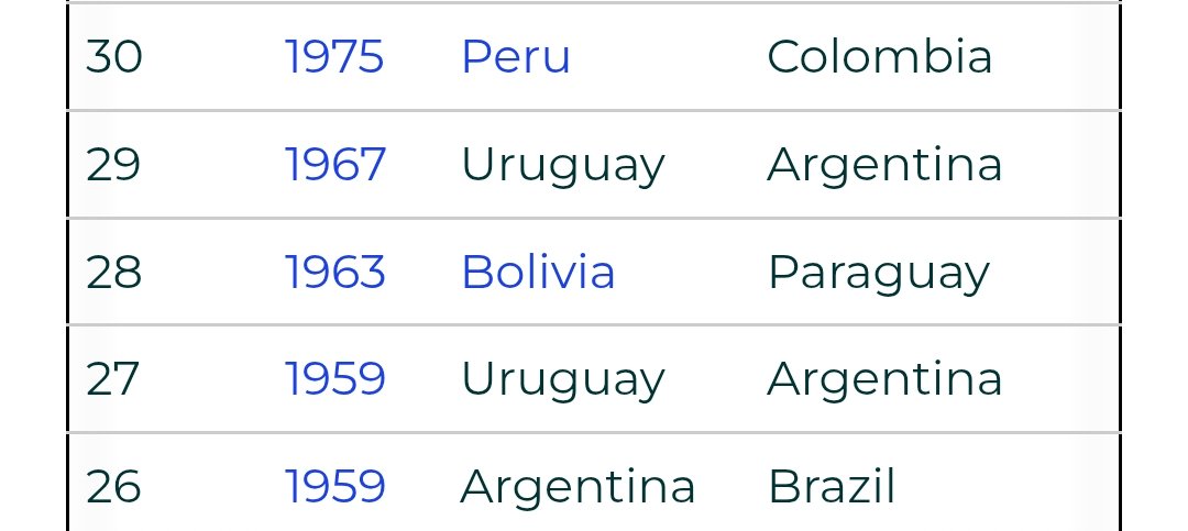 6. Born in 1982 sadly never had the opportunity. But although they won 3 out of 4 world cups including 2 back to back they didn't manage to win the copa america. Screen shot with winners on the left, defeated finalist on right.
