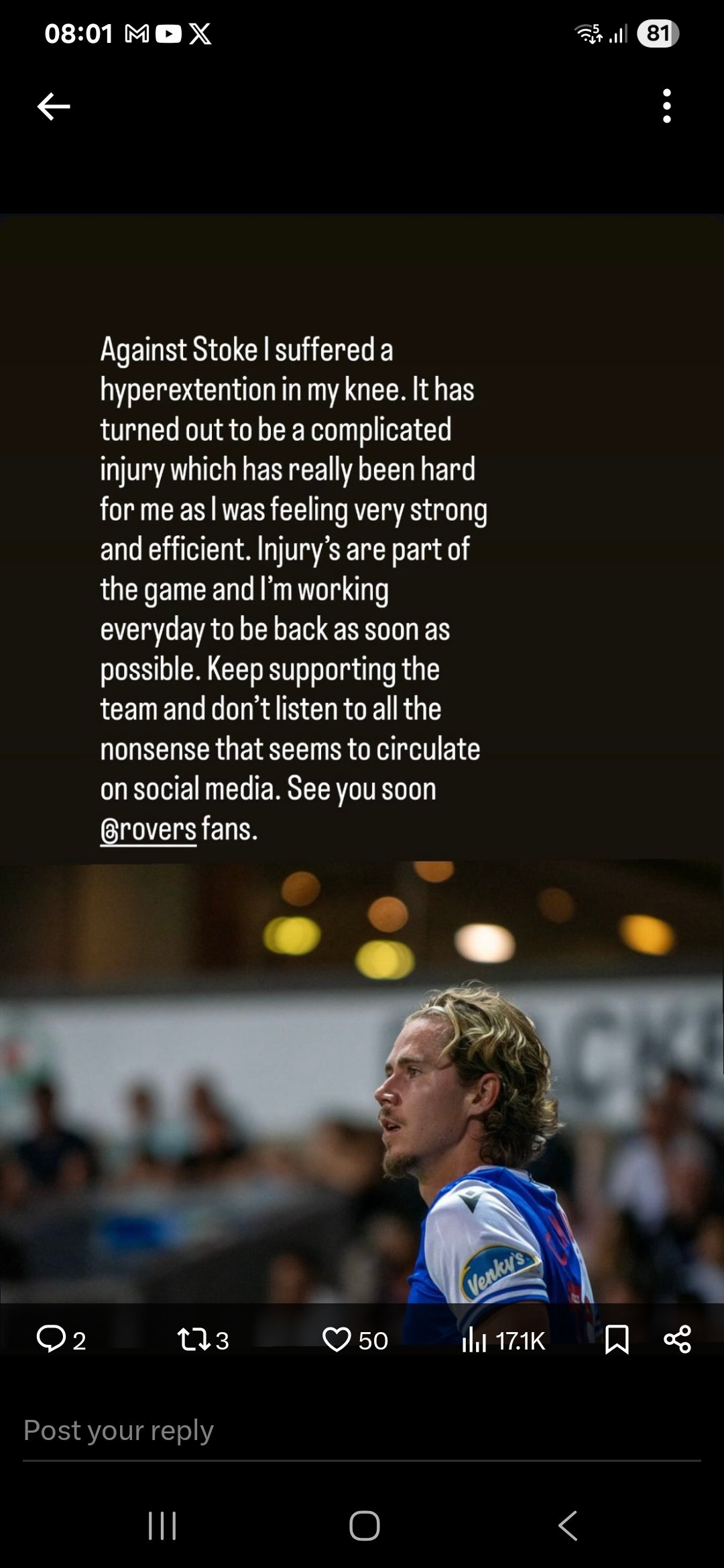 Thanks 🙂 To me, that only references the injury, none of the rest of the speculation If he is still here in February, and surpasses 50 league appearances, then I will concede that all of the speculation should be put to bed. I suppose Rovers could put an end to any speculation even sooner and give our captain & star player a contract extension -