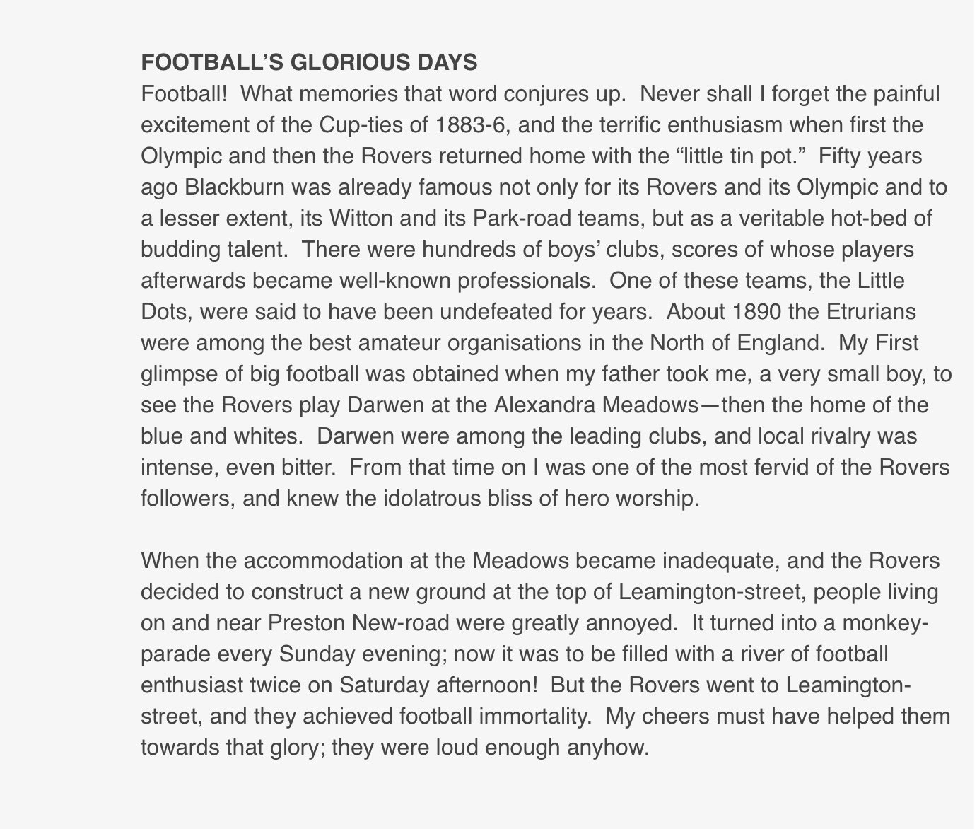 Someone else mentioned that there was a Rover St named after the ground after it wascobbled over which was later renamed Wellfield Rd as it still is today. Wellfield Rd is a very flat bit but Im guessing it would be slightly further over towards East Lancs Cricket Club than where the pitch was or at least would have marked the boundary of the ground on that side. -