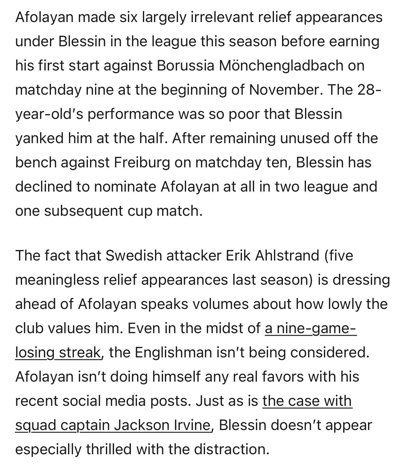 Updated list, following Afolayan signing Each player is linked to Rovers confirmation of their last contract signing, Options only noted where specifically mentioned by the club, although as we have seen in the past (eg Hyam) sometimes these are not disclosed. Expiring in 2026 - Tronstad, Forshaw, Hedges, Mullarkey-Matthews, Khan, Farkas, Stritch, Dlamini, Wood, Boggan, all current 2nd year scholars including Tyjon Expiring in 2026 but with an option - Honor, Pratt, Olson, Batty, Duru, Montgomery, O'Grady-Macken, Loan expiring in 2026 - Cashin Loan expiring in 2026 but with a purchase option - Baradji, Gardner-Hickman Expiring in 2027 - Afolayan, Toth,, Carter, Garrett, Cantwell, Kargbo, Edmondson, Doherty, all current first year scholars including Higgins Expiring in 2027 but with an option - Barrett, Goddard, Pickering, McLoughlin, Ribeiro, Ohashi, Litherland, Houghton, Powell, Pears (Gestede confirmed in the leaked phone call), Expiring in 2028 - O'Riordan, Tavares, Eze Expiring in 2028 but with an option - Atcheson, Miller, Alebiosu, De Neve, Gudjohnsen, Morishita, Wharton, Expiring in 2029 - - Expiring in 2029 but with an option - Henriksson, Michalski, Jorgensen, Davies,