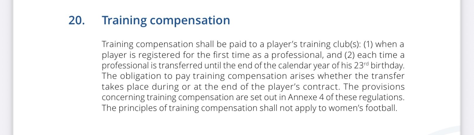 I’ll try but you might have more faith in me than I do 😁😁. As he’s moved abroad it’s the FIFA regulations which apply. Their rule regarding training compensation makes no reference to have trying to retained the player (see below) I believe the figure due for Bloxham would have been £120,000 (2 years at club x £60,000) or thereabouts (part years at a club are prorated). (I’ve made the assumption Grasshoppers are a category two club for training compensation, the highest category a Swiss club can be in).