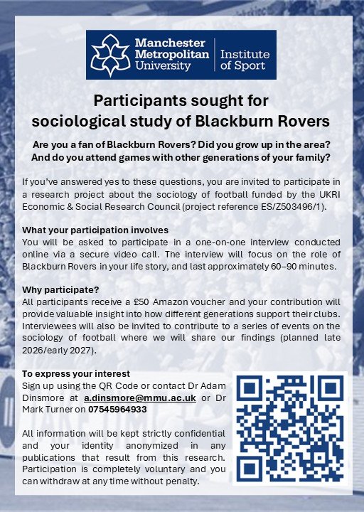 Hi - I'm Adam Dinsmore from the MMU Institute of Sport in Manchester. We've just launched an ESRC-funded project on the sociology of football in the North of England in partnership with the Football Supporters Association (FSA). We spoke last month with Glen Mullan, who you may know as Chair of The BRFC Action Group. Glen advised that BRFCS was the ideal place to reach Rovers supporters who might be interested in contributing to the project. In a nutshell, we'd like to speak with as many Blackburn Rovers supporters as possible about the role that the club has played in their life story. The project is run by fans for fans, and we hope to contribute to public discourse around the new Independent Football Regulator. Particularly, the IFR's legal duty to protect the heritage of English football. Your experiences and perspectives will directly inform policy recommendations on what heritage protection should mean for supporters and their communities. What's involved: Participants will sit for a one-on-one interview conducted online or in-person. The interview will focus on your relationship with Blackburn Rovers and how the club and town have changed over time. We expect interviews to last 60–90 minutes. All data will be anonymised and stored securely in accordance with university ethical guidelines and GDPR. All participants receive a £50 Amazon voucher for their time and invitations to a series of events on the sociology of football where we will share our findings (planned late 2026/early 2027). You can withdraw from the study at any time without penalty. Who we're looking for: We're seeking Rovers supporters of all ages and backgrounds. You don't need to be a season ticket holder or attend every match - we're interested in hearing from anyone who identifies as a Blackburn Rovers fan, regardless of how you follow the club. If you are interested in being interviewed, you can sign-up at Beacons.ai/BRFCStudy or contact Dr Adam Dinsmore directly at a.dinsmore@mmu.ac.uk. I’ve attached a flyer (below) with a QR code that can be forwarded to anyone who may be interested. We’ll be handing them out near Roverstore before the Derby game on Saturday if anyone wants to discuss the project there.