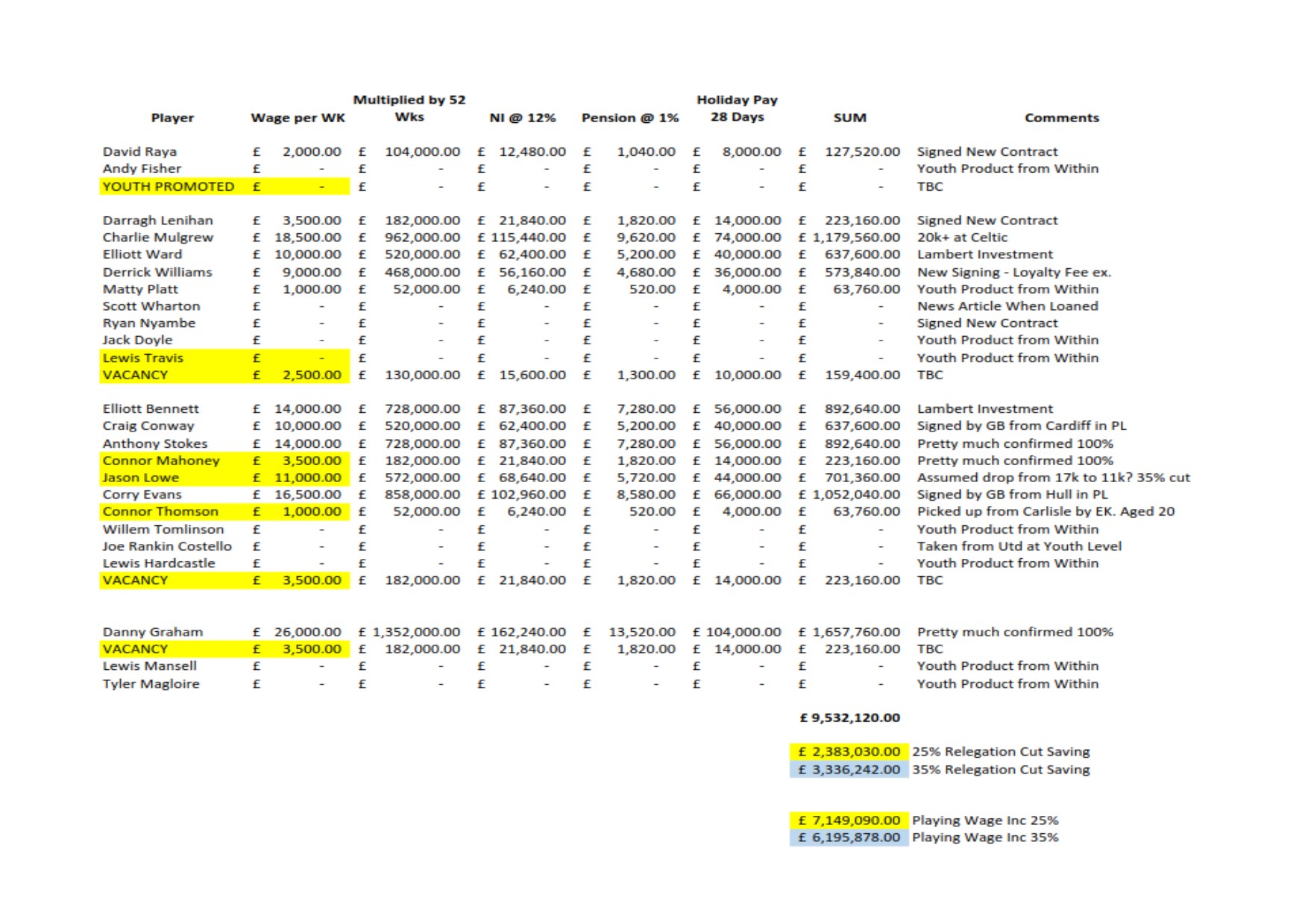 chaddyrovers Posted May 11, 2017 Posted May 11, 2017 4 hours ago, Dunnfc said: I swear I've seen something relating to youth and appearances for the first team but on the context your perhaps correct it would give you a Jason Lowe on 11k a week or chance to sign Danny Guthrie again and put the rest of the wages to another position or vacancy etc. Mahoney already 20 Question is how does the donation go in? If it's staged then I can't imagine it's allowed to then increase the wage bill as that's checked under SCMP rules frequently and must reflect the 60% of turnover, however if they put in a lump sum say 7 million on day one of the season then in theory you could add an additional 60% of that to your playing budget around circa 4.2 million (I know I know) as technically the funds are still classed as turnover but then we'd been in the same situation as having no capital to cover operating expenses. On the premise they continue in the same vain as we've seen in recent seasons and just fund the expenses then that 6.2 ish budget worked against the turnover of say 11 million looks like this amended without the kids and inclusive of Lowe. I didn't realise Conor Thomson is older than 20! but as the youth are mainly on 1k or less then it's far from big bucks. Certainly gives you a picture and shows the task TM has this summer if he don't get cracking soon. or some cash. Firstly thanks for doing this work above outstanding effort. Nixon has confirmed to me that Graham and Mulgrew do have relegation percentage wage drop in their contract. I think Mulgrew, Stokes, Lowe and Mahoney will be leaving this summer. So that's does free some cash up for free transfers(plus a couple of cheap signings aswell) signings. But we need experience Keeper, Centre back, pacey winger, 2 strikers and 2 centre midfielders. keeper - Jon McLaughlin (Ex Burton keeper just released) Centre back - Nathan Thompson (ex Swindon) or Willis from Coventry but that would be a cash buy but only around 250k Pacey Winger - Nathaniel Mendez Laing (Ex Rochdale) or Lloyd Isgrove 2 strikers - Lyle Taylor, Jonathon Obika, James Vaughan(Cash Sale), Paddy Madden(Cash Buy) 2 centre midfielders - Louis Thompson, Liam Trotter, Jack Price, Ryan Tunnicliffe