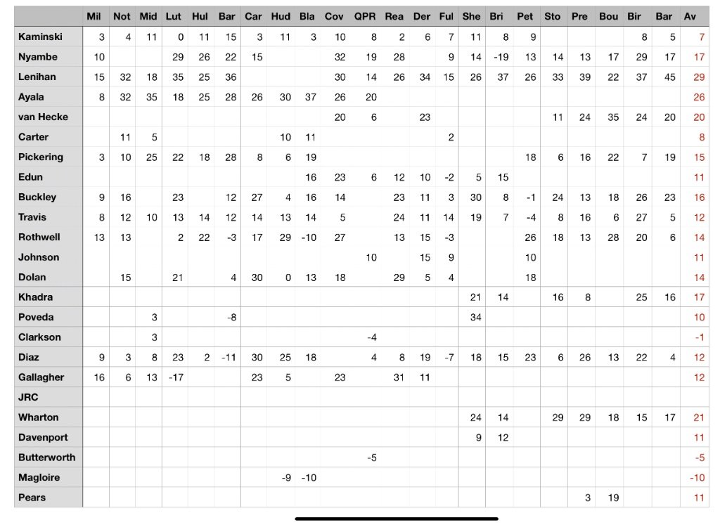 tonyoz Posted December 30, 2021 Posted December 30, 2021 (edited) PLAYER WATCH v Barnsley Each incident in the match was rated on the following scale: +5 GOAL +4 Excellent play +3 Very good play +2 Pleasing/good play +1 Decent play 0 Routine stuff -1 Sloppy play -2 Disappointing/poor play -3 Very poor play -4 Terrible play -5 Own goal The ratings for each player were then combined to produce a measure of the players overall contribution to the match. Ratings Key incidents per player = coloured stars Overall contribution = numbers Kaminski **** ** 5 Nyambe ************* * 17 Lenihan ***************************** *** 45 Wharton ****************** ***** 17 van Hecke ************** *** 20 Pickering ***************** ***** 19 Travis **************** ********** 5 Buckley (84) ********************** ******** 21 Rothwell (84) ******** ******* 6 Khadra (63) ***** * 11 Diaz ************ ********** 4 Gallagher (63) *** *** 1 Edun (84) ** * 2 Dolan (84) * ** -2 Highlights and Lowlights (A justification for the main ratings given above) 02 Oh dear! Two Barnsley men clash heads in Rovers half and the ref blows up immediately. Buckley fires a great ball into the right channel for Khadra to chase and he hasn’t heard the whistle, neither has the defender. Khadra outpaces him impressively to run clear and from just inside the box he puts it past the goalie on his near post. Painful for Khadra to swallow….and the Rovers fans but I left the ratings in there. Somebody turned the volume up! 09 Nice long ball from Wharton to Diaz on the left wing but he’s offside. 12 Not a lot happening. Barnsley are a bit sloppy in their own half but they have some good players. Travis has been ineffective so far. Rothwell has hardly touched the ball! 14 A nice Barnsley move sees Styles take a shot from just outside the box. Kaminski dives to his right to parry the ball away. It comes back to Palmer but his shot from 20+m is well over the bar. 17 A nice clearance pass from Lenihan to Buckley who spins delightfully away from his close marker and squares to Pickering who takes it on. Eventually the previously anonymous Rothwell gathers on the left wing halfway in the Barnsley half. He does a wide 360 degree turn and passes back to Pickering….but keeps running. Pickering returns the ball and Rothwell is away from 2 defenders and he storms into the box. He’s only got the goalie to beat but his shot from 10m goes across the goal, hits the right post and bounces back almost along the goaline. Barnsley clear. 20 Some nice intricate play around our box by Barnsley sets up a chance for Palmer again, Rothwell’s challenge is poor but the shot is blocked by Wharton and Pickering clears. Barnsley don’t look like a bottom of the table side here. 22 A nice long ball from Lenihan finds Diaz on the left wing. He drives inside but his attempted shot was a Brereton special…..row Z. Van Hecke robs a Barnsley man midway in their half and Buckley picks it up and glides past the startled defenders. He’s into the D and with only the keeper to beat he puts it narrowly past the right post. Bad miss after the hard work had been done! Is it going to be one of “those days”? 23 That’s a terrible pass by the defender straight to Buckley. He releases a perfect pass for Rothwell to run on to 30m out. He takes it to the edge of the box and this time there’s no mistake, he plants the ball low into the right side of the net! 27 Another neat pass from Buckley finds Nyambe in a bit of space and he manoeuvres into the box and tries a left footed curler but it’s Ryan and his shot curls comfortably past the far post. 35 Khadra receives the ball midway in Rovers’ half and he sends Buckley free and clear with a wonderful through ball beating the offside trap. He slows down at the edge of the box waiting for Diaz to arrive but, when he tries to set Ben up, his pass is too weak and a Barnsley man gets a foot in. Bad, bad miss…..Buckley should have kept going and shot himself or, at least, put decent weight on his pass. Ben deserves credit for his run! Chances are going begging and Barnsley aren’t out of this yet! To make matters worse, the resulting corner is hit straight into touch by Rothwell. 36 Diaz does really well to keep Pickering’s long pass in play and he’s off into the box. His shot from just to the left of the 6 yard box is parried away. Good play from Ben. Eventually Khadra gets the ball on the wing 30m out and his cross into the box almost reaches Pickering who had made a good run. The keeper gathers. 41 Lenihan fires a great long ball from the right wing to the edge of the box where Diaz is lurking. Although Ben brings it down well with his chest, his shot is saved by the keeper. He was offside anyway! We need that second goal! 44 Some good approach play by Barnsley and the right winger goes past Travis too easily and crosses from the byline but Wharton is in position to clear. Then Lenihan jumps in on halfway to make an interception. He has the perfect chance to send Diaz clear but his pass is blocked and the moment has gone. Barnsley come again! Pickering has 2 men to mark on his own and one of them manages to get in a cross from the byline. Lenihan has managed to get back and blocks it in the 6 yard box but it hits Wharton and deflects back towards goal. It’s panic stations as Van Hecke, Wharton and Rothwell fail to clear. After more bobbling about, the ball comes to Morris just inside the box. His shot is deflected by Nyambe on to the right post…….the ball runs agonisingly back along the line and a baffled Kaminski can’t stop it rolling over the line just inside the left post! Let’s hope we don’t rue those missed chances…..as so often in the past! 47 Some all-round good play by Lenihan since the re-start. This time his crossfield pass into the box reaches the on-coming Rothwell just outside the 6 yard box, but his attempted left-footed volley is best forgotten. 49 A dangerous moment there. Everyone se