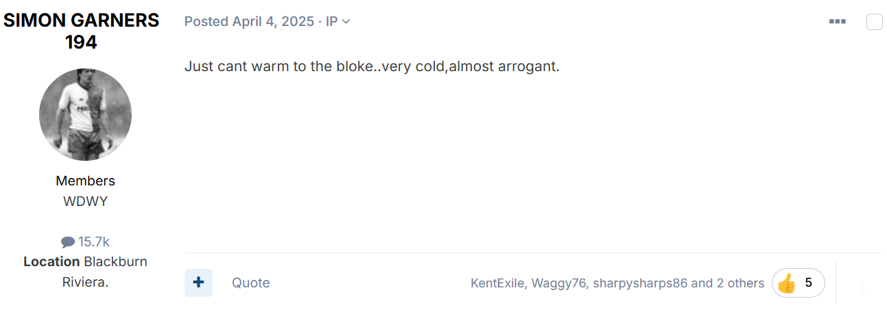 Members Popular Post rog of the rovers Posted 1 hour ago Members Popular Post Posted 1 hour ago (edited) Valerian Ismael and Blackburn Rovers never felt the right fit. Chants of "You're getting sacked in the morning" from the Blackburn End, just four games into his reign as Rovers were 0-2 vs. Middlesbrough after 8 minutes. 4 home wins as Rovers boss. Home record P21 W4 D7 L10 F24 A31 Pts 19 GD -7 19 points from a possible 63 in 11 months as Rovers boss (just short of half a season in terms of games played) The "list" picture for Radio Lancs. Publicly criticising the lifestyle choices of Hayden Carter "assess everything in his life". Publicly criticising Lewis Travis who "let everyone down". The choice to make Todd Cantwell captain has been mixed (to say the least) Zenith - Rovers 4-1 Millwall - Good Friday 2025, one of few standout performances Nadir - Swansea 3-1 Rovers - January 2026, one of many subpar performances Record 13 injured players Two rained off fixtures Is it all Ismael's fault? Of course not, recruitment has been shocking, not every injury was his fault and a swathe of refereeing decisions have gone against him/us/Rovers. But you can't say it hasn't been coming and isn't ultimately the right thing for the club. Au revoir Val. Fin Edited 1 hour ago by rog of the rovers 13 Quote