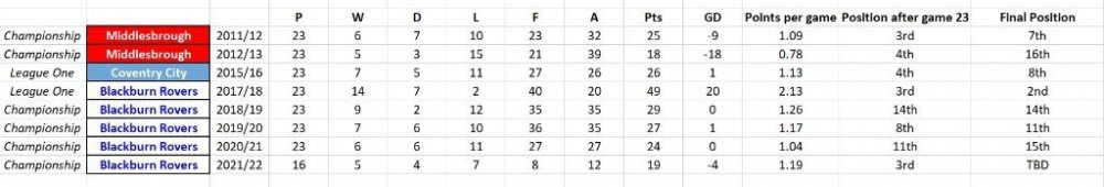 Further to my tweet which gathered a lot of reaction on Saturday, I thought I'd run the data on Tony Mowbray's record in the second half of seasons (Matches 24 to 46) over the past decade. Inspired by @MarkBRFC He's had 7 full second halves of seasons in the past 10 years, across two levels. I've also included this season for reference. Not included are the ends of the 2014/15 season with Coventry City (Mowbray joined 3rd March) and the 2016/17 season with Rovers (Mowbray joined 22nd February). -