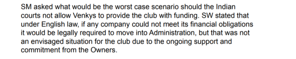 Thanks to all involved for posing the questions. But how on earth can he say it's not envisaged because of the owners (blah blah blah) when it's completely out of his and their hands?! If they are prevented from paying their dues by the Indian Court then there's no other way of doing so and it's admin!