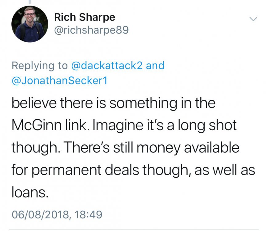 Well that does it!! I like Rich but he doesn’t usually stick his neck on the block like this...if he’s admitting an interest in McGinn it’s fair to say that we are probably trying to get that one over the line by Thursday!! ?