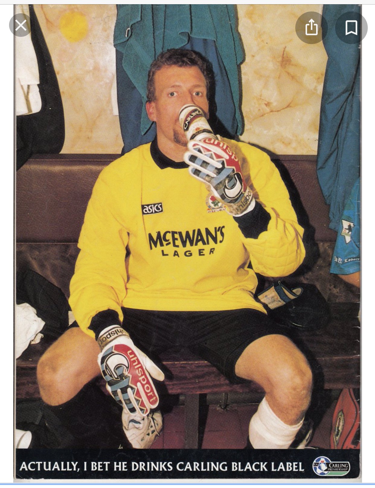 So I only heard about his recently. Apparently Carling jumped on the fact that the Rovers players were drinking Carling (sponsors of the premier league) in the dressing room at Anfield after winning the league. Does anyone remember this? I can’t imagine McEwans Lager were too happy. By the way, love that keeper jersey, never seen one for sale.