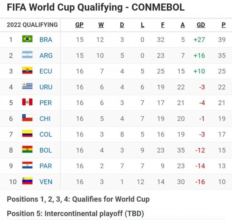 It is still a tight race. The teams fighting it out (Chile, Perú, Uruguay, Colombia) would be just as happy qualifying directly as the playoff, since the view from South América is that playing the Asian 5th is as good as qualifying. Here is the current table going into the final 2 games in March. Chile play Brazil away and end vs Uruguay at home. A tie vs Brazil would be considered a "win" since Chile has little hope of beating this Brazil in Brazil. Chile's hopes rest on defeating Uruguay, with Chile having a slightly favorable goal difference at this point vs its 3 other rivals for the last spot. Looking at Chile's qualification rivals these last 2 dates: Colombia host Bolivia (likely COL win) then end away at Venezuela (toss up). Perú is away vs Uruguay (likely URU win, most important game for Chile) then end at home vs Paraguay (PER favored). Uruguay host Perú and end with Chile away. Chile's qualification depends in large part on how their direct rivals fare the last dates. If Chile can get 3pts and Perú loses both or merely ties at home, Chile could clinch the 5th spot....if Colombia doesnt win both its last games. If Chile can get 4pts they would likely get the 5th spot. Only Chile winning both games (highly unlikely) would they be guaranteed anything. CONMEBOL qualification is always decided on the last day. And the 2 top teams Brazil & Argentina still have a game to make up.