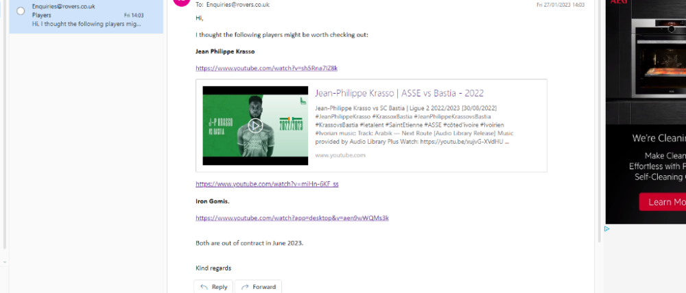 Hi, First time poster here. Not sure if it's coincidence or not, but I was a little bored at work on Friday and I sent an email to general enquiries at Blackburn, I attached the YouTube video of Krasso and said that he was worth a look as his contract was expiring in June, who knows if he was on their list to begin with or if it's the player they are looking at today 🤣