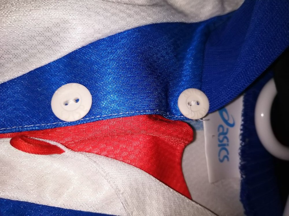 My main concern is the sponsor. My old jersey had a raised white background with indented red lettering, however the new to me jersey has raised red lettering. The other standout difference is the buttons. My old jersey had no markings on the buttons, the new one has "asics" in raised lettering.
