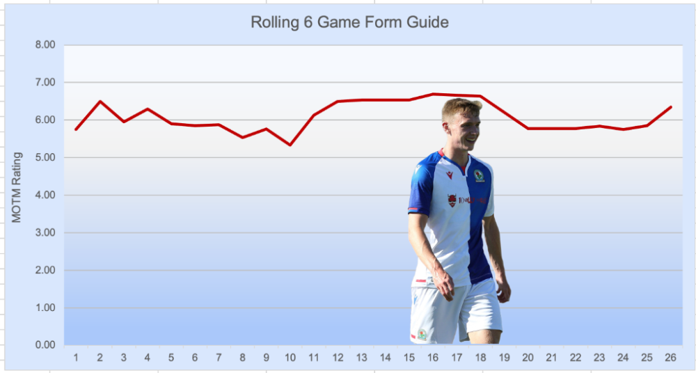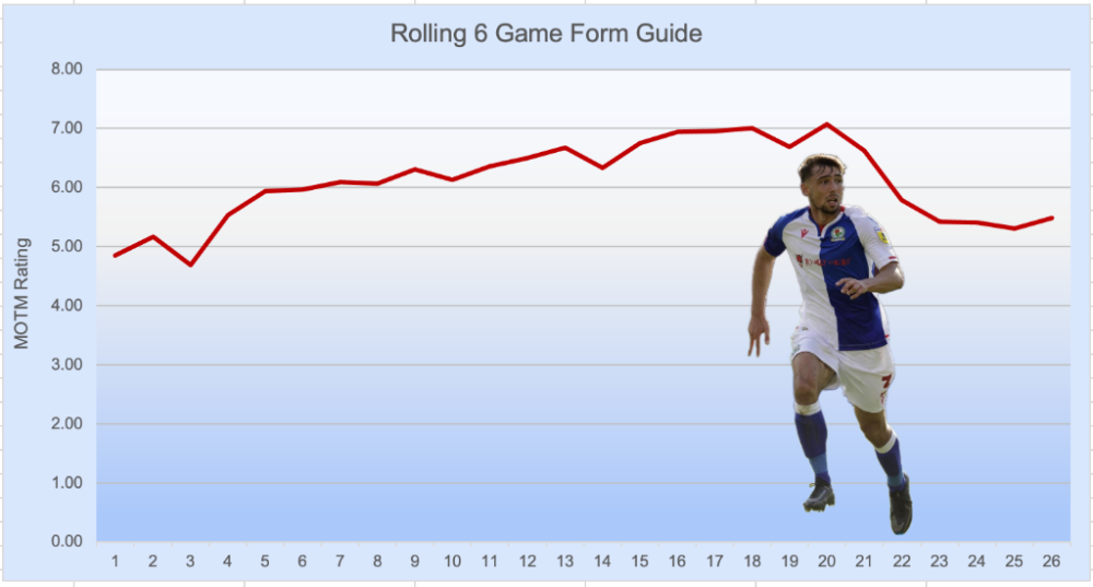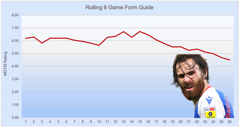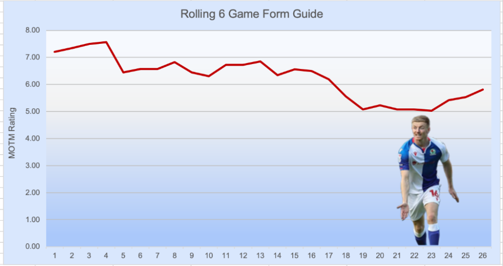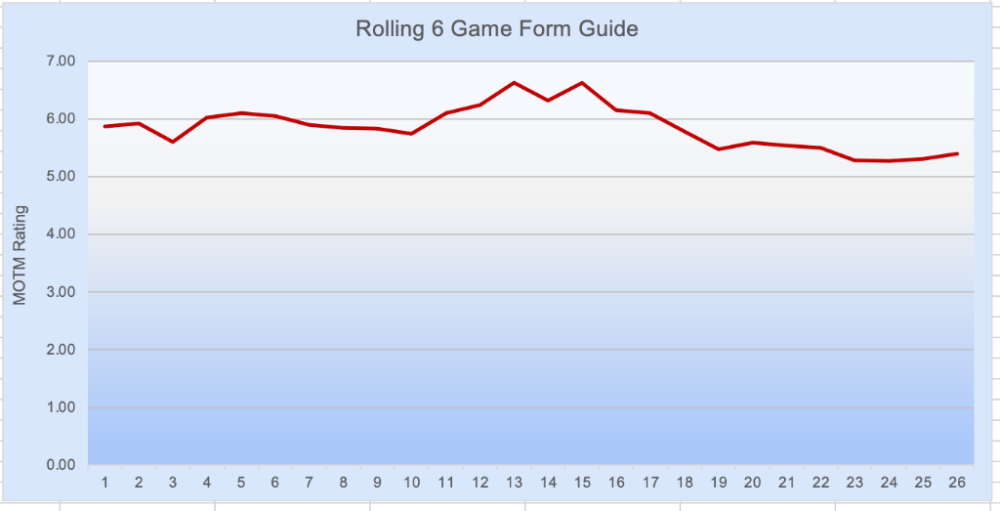 We’ve collated the data from each match & using a 6 game rolling average* as a means of identifying form trends, here’s some graphs that you might find interesting… This is the team form graph. Data point 16 is the first 6 game score that includes the Burnley game BTW & the data from the Blackpool game is the last data point. *Why rolling averages ? If you are interested… https://www.indeed.com/career-advice/career-development/what-is-rolling-average