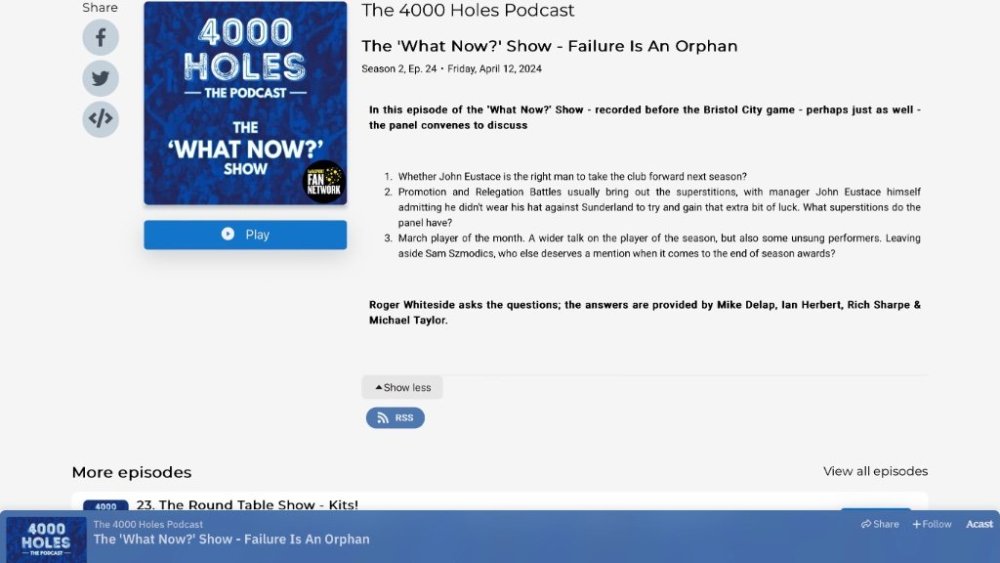12. In this episode of the 'What Now?' Show - recorded before the Bristol City game - perhaps just as well - the panel convenes to discuss Whether John Eustace is the right man to take the club forward next season? Promotion and Relegation Battles usually bring out the superstitions, with manager John Eustace himself admitting he didn't wear his hat against Sunderland to try and gain that extra bit of luck. What superstitions do the panel have? March player of the month. A wider talk on the player of the season, but also some unsung performers. Leaving aside Sam Szmodics, who else deserves a mention when it comes to the end of season awards? Roger Whiteside asks the questions; the answers are provided by Mike Delap, Ian Herbert, Rich Sharpe & Michael Taylor. Listening links here