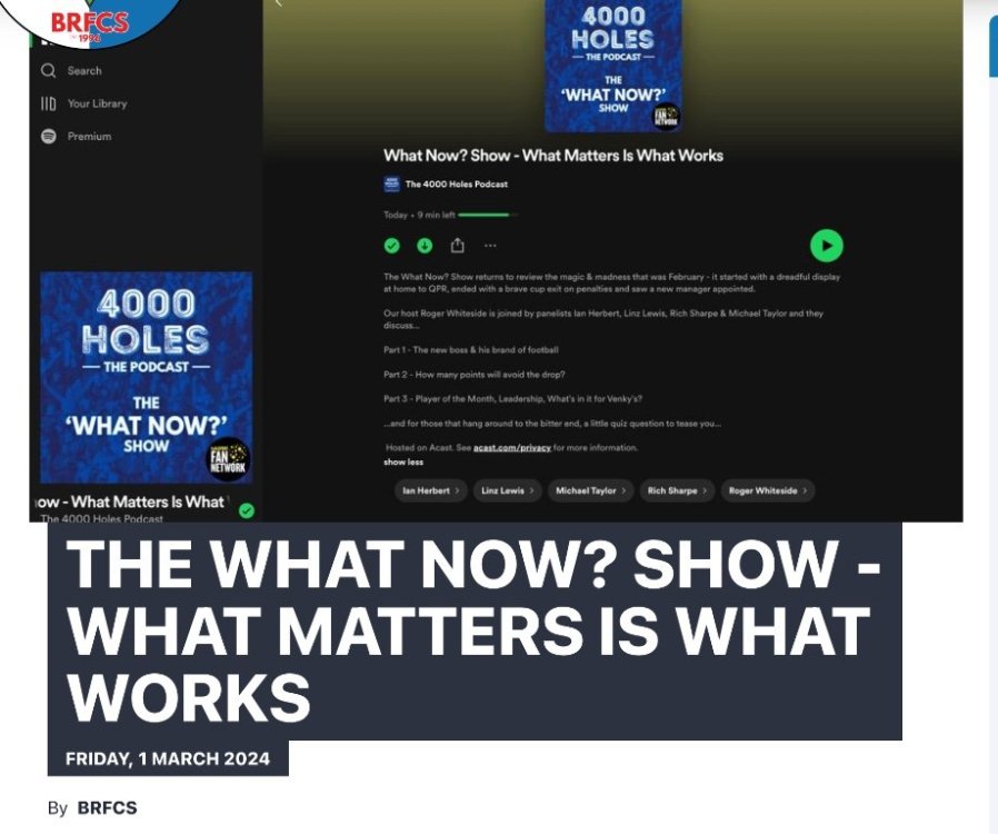 https://www.brfcs.com/magazine/podcasts/the-what-now-show-what-matters-is-what-works/48 The What Now? Show returns to review the magic & madness that was February - it started with a dreadful display at home to QPR, ended with a brave cup exit on penalties and saw a new manager appointed. Our host Roger Whiteside is joined by panelists Ian Herbert, Linz Lewis, Rich Sharpe & Michael Taylor and they discuss... Part 1 - The new boss & his brand of football Part 2 - How many points will avoid the drop? Part 3 - Player of the Month, Leadership, What's in it for Venky's? ...and for those that hang around to the bitter end, a little quiz question to tease you...