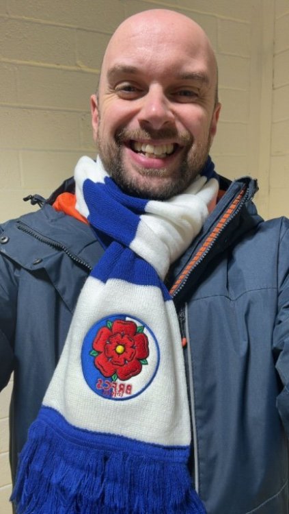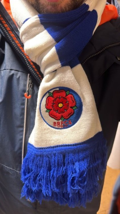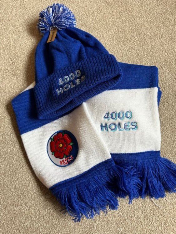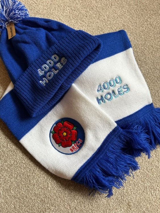 As well as hats, we have a few scarves - also £10 plus P&P (for the UK that would be £5) or we can arrange collection at the QPR game at Ewood. The BRFCS logo at one end, 4000 Holes the other… Modelled here by our very own @rog of the rovers ⚪️🔵 -