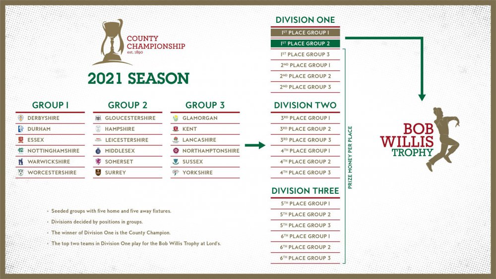 Clear as mud. Diagrammatically it appears only the winners of group one and two go to the final. But it does say the winners of div one are county champions and the top 2 compete for bob Willis trophy but mentions nothing about how that bit happens. Having gone into division one does everyone play each other again. If so is it once or twice, home or away.