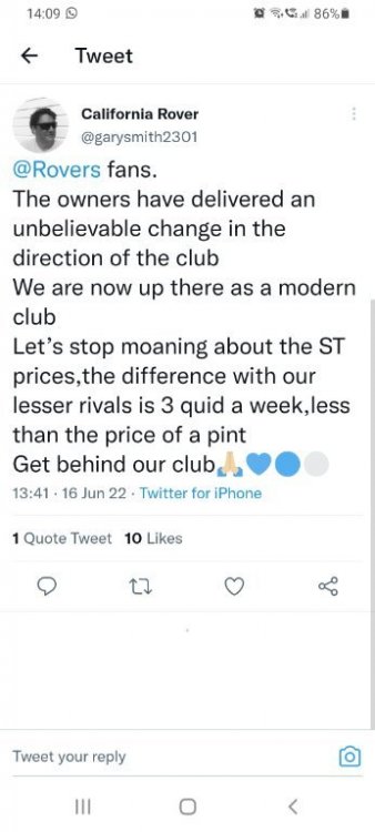 I think this sort of attitude is not only rife but its potentially dangerous as its justification for the powers that be to keep season ticket prices stupidly high. Clearly someone financially stable (and perhaps not fully in touch with the economic situation of Blackburn whilst living in California in this instance) showing a lack of empathy and understanding. People with a superfan mentality implying that its down to backing the club or the manager. Also, a bit premature with the "unbelievable change" and "modern club" narrative.