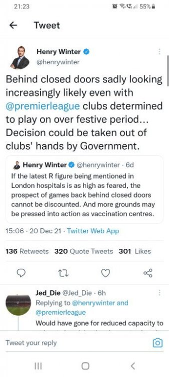 Widespread reports about a 2 week circuit breaker which will inevitably go on beyond that. To expect football grounds to continue as normal amidst that would be naive. I am against a lockdown but I think after today there wont be any live football in stadiums for a bit. -
