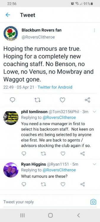 Just that Alan Myers, someone who has been totally out the loop for a number of years, asked in a quite clearly non comittal tweet about what supporters would do should Venkys sack Mowbray, which he was clear not to directly suggest. You also mention 3pm tomorrow? Is this based just on Alan Myers' tweet? Im just wary of random, unsubstantiated statements such as this getting people into a premature frenzy.